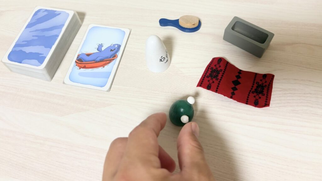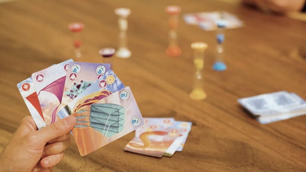 各プレイヤーは順番に手札から1枚カードを出し、対応する色の砂時計をひっくり返して時間をリセットします。カードを出したら山札から1枚補充し、これを繰り返します。
