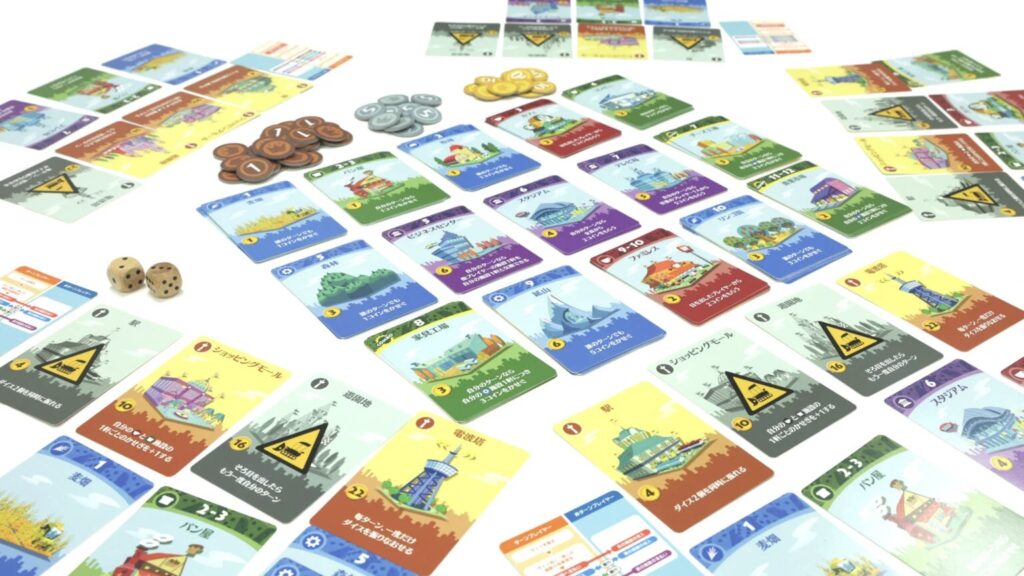 建てた施設は自分のターンだけでなく他プレイヤーのサイコロ目でも収入を生むものがあり、「他人の出目にも期待できる」のが面白さのひとつ。