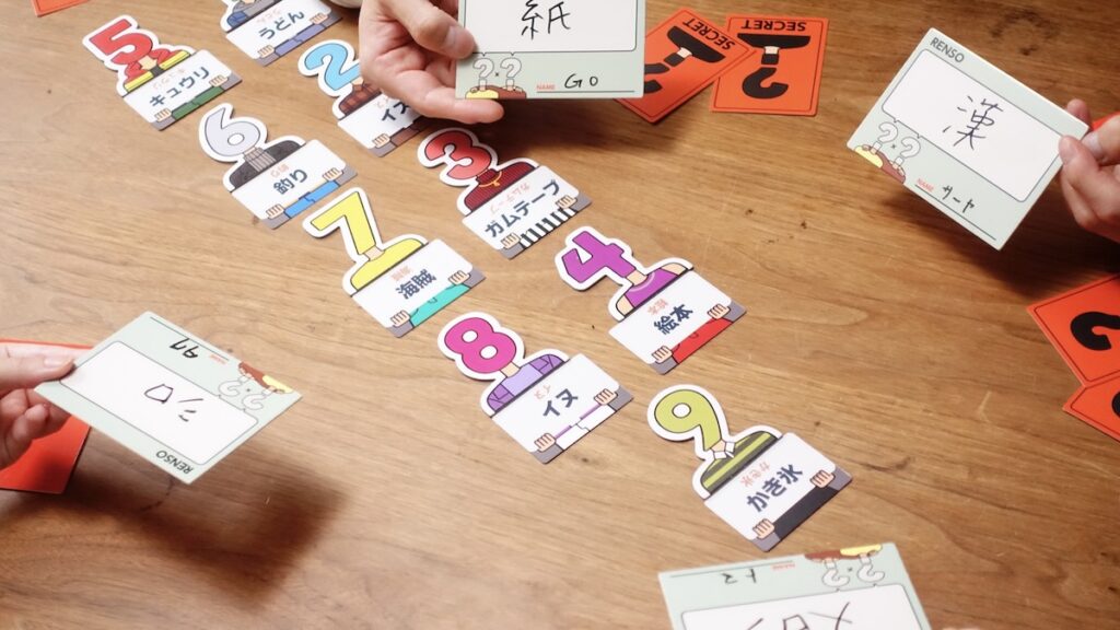 みんなで相談して並べ終えたら、裏返して順番が合っているか判定し、成功すれば手札を増やして難易度を上げていきます。