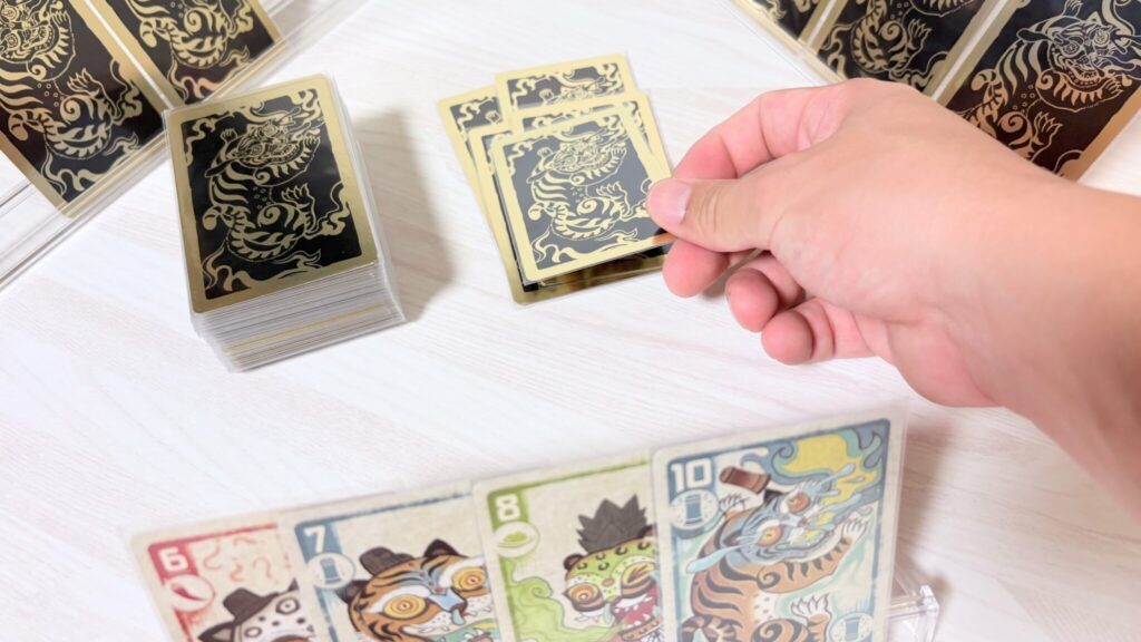 自分の番では、場より強いカードや枚数で勝負するか、パスして山札から引くかを選択します。
