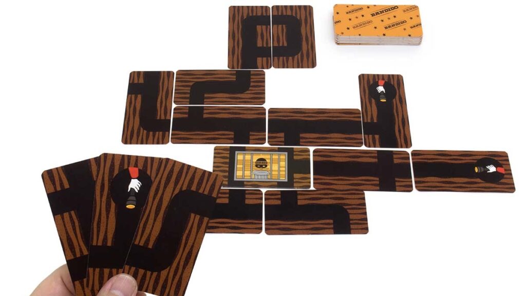 道はどの向きでも置けますが、つながらないようには置けません。全ての通路の出口を行き止まりかループでふさげればプレイヤーの勝利、山札と手札が尽きて塞げない出口が残るとバンディドの脱走成功で敗北です。