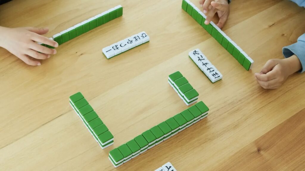 牌を引いて捨て、形を作る流れは麻雀そのものですが、難しい役や点数計算がありません。作るのは「ひらがなの単語」だけなので、麻雀未経験者や子どもでも直感的に理解できます。