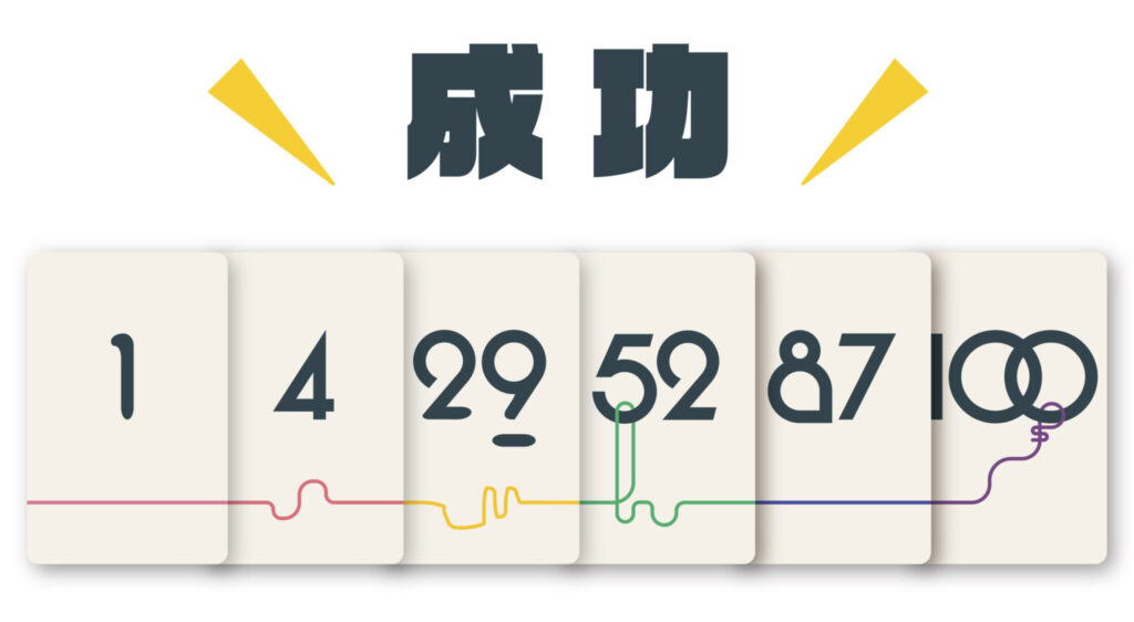 数字は1〜100まであり、自分だけ数字を見て他のプレイヤーの言葉を頼りに順番を考えます。