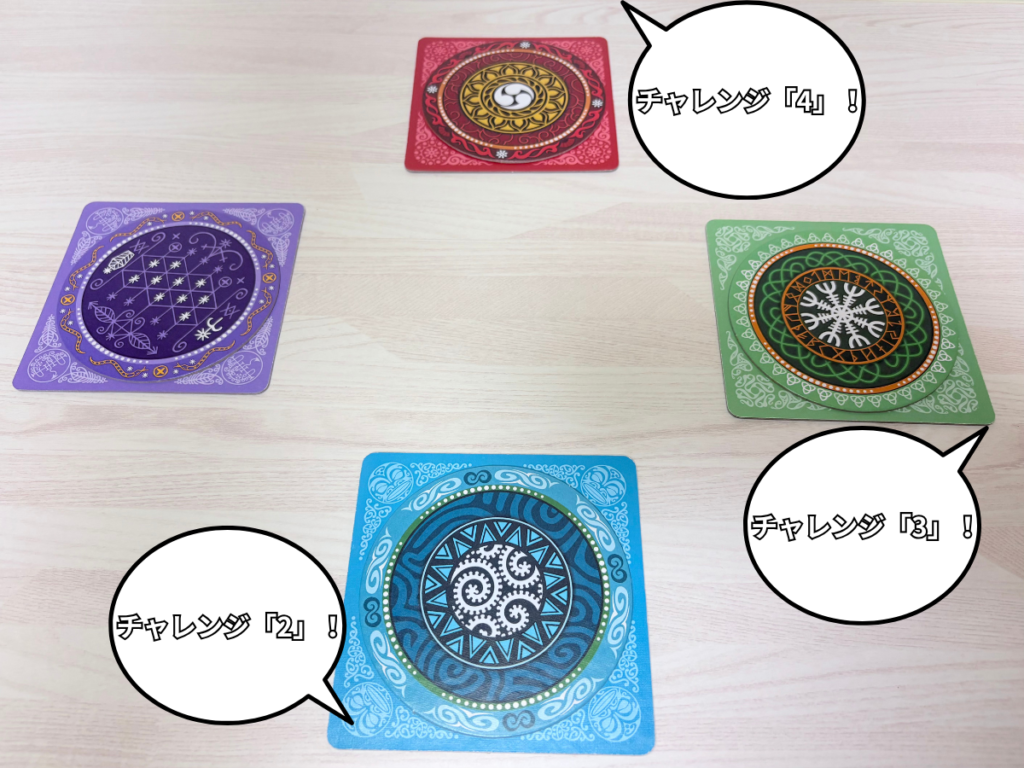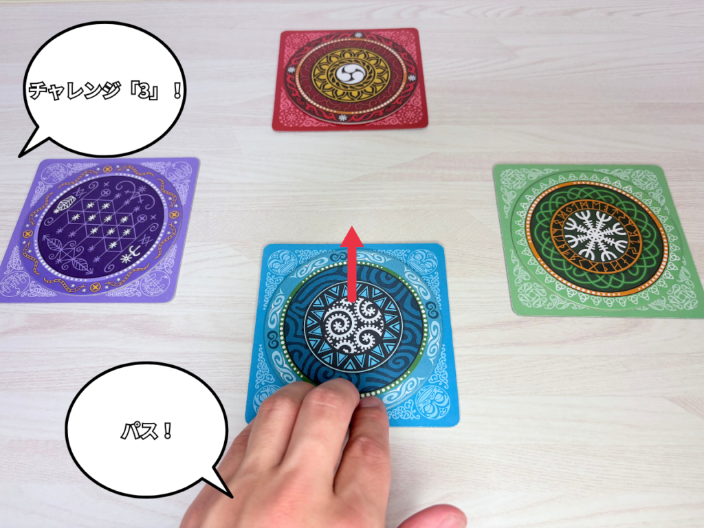 1人を除くすべてのプレイヤーがパスするまでこれを続け、残ったプレイヤーが「チャレンジャー」となります。