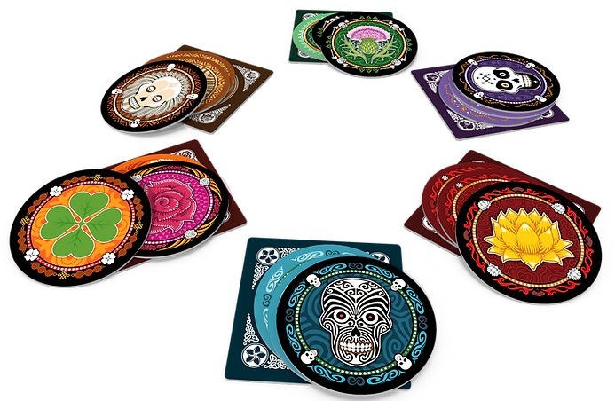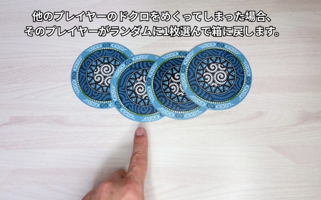 - 他のプレイヤーが置いたドクロをめくった場合、ドクロを置いていたプレイヤーがランダムに選んだディスクを裏向きの状態で箱にしまいます。