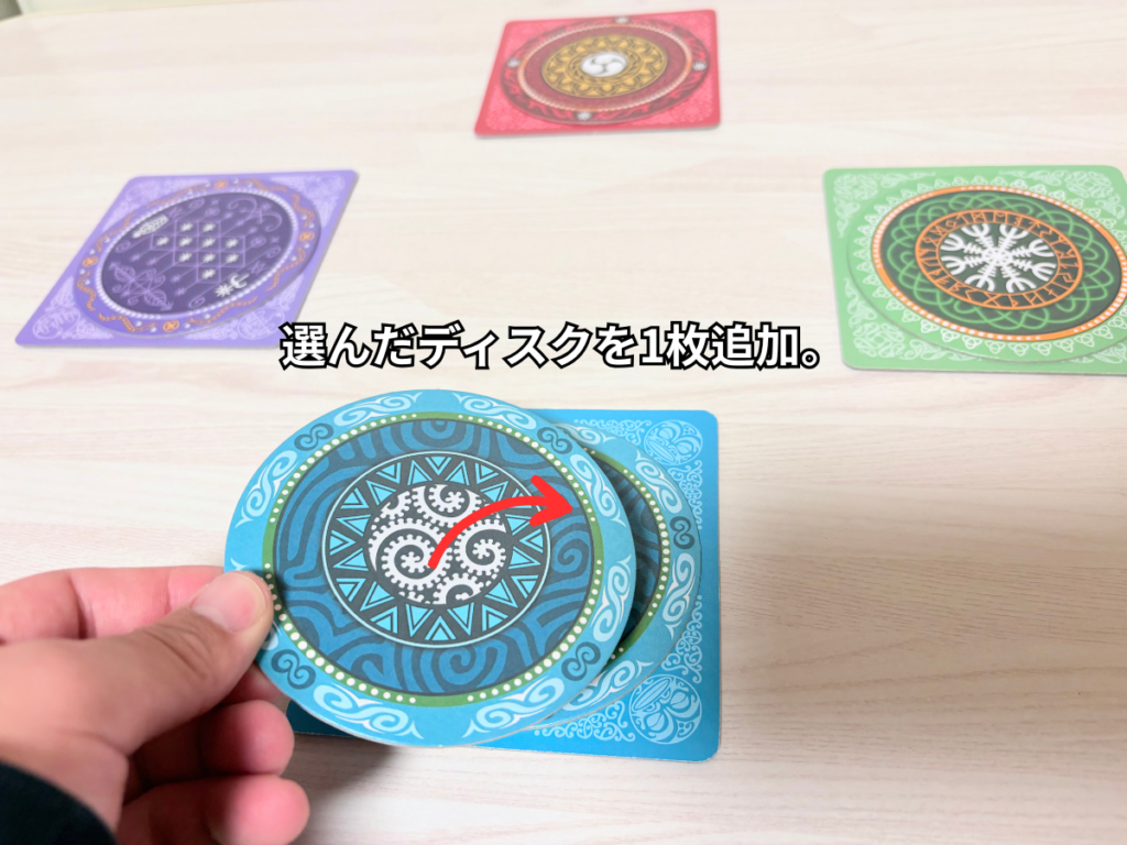 残りのディスクの中から1枚を選び、配置済のディスクの上に重ねて置きます。