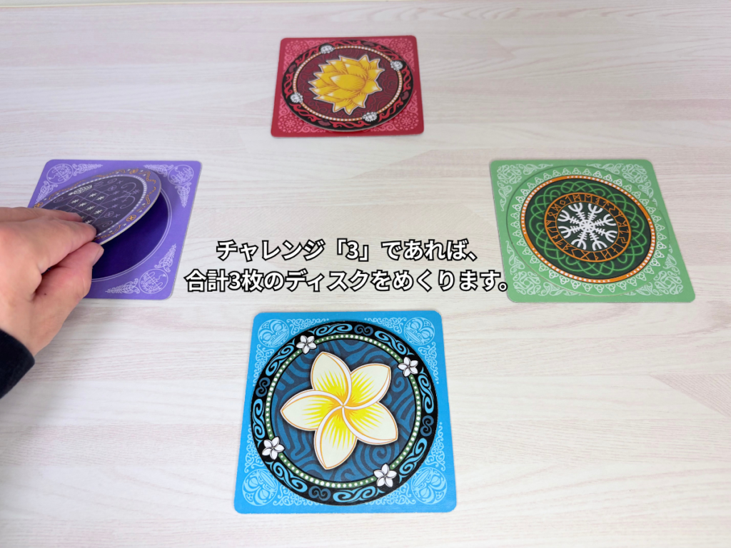 「チャレンジャー」は、自分の宣言した枚数と同じ枚数のディスクをめくらなければいけません。